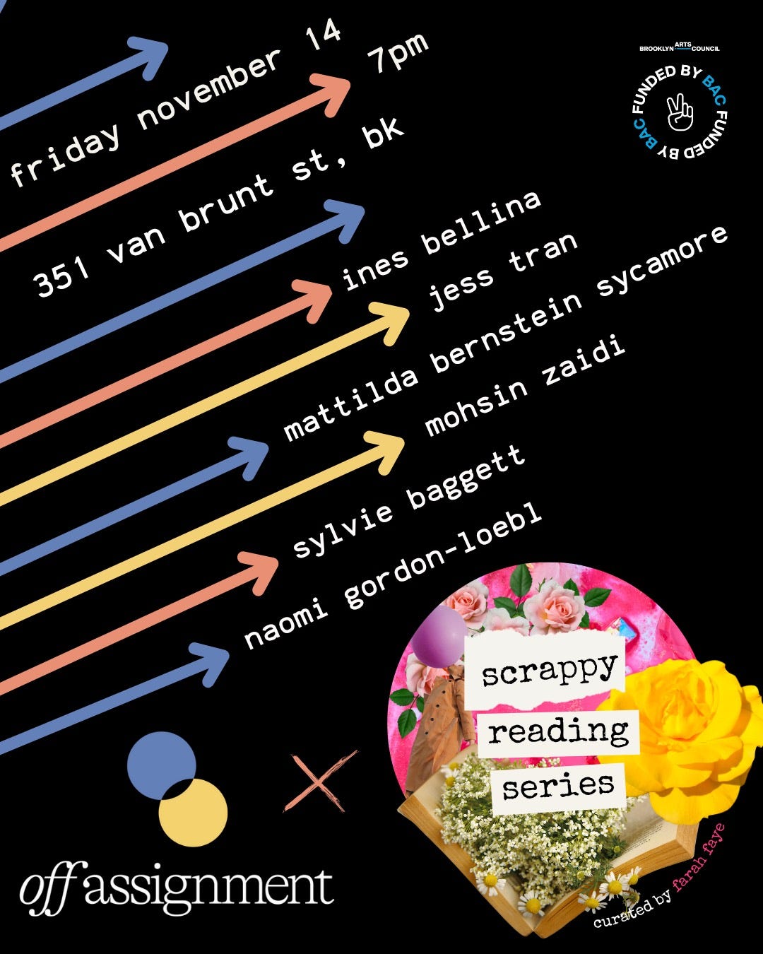 My other small piece of news is that I’m reading, alongside a bunch of very talented folks, at an event on November 14th in Brooklyn (flyer below), and I’d love if you were there! Tickets are free—just RSVP here—and the theme is “scrappy.” Still haven’t decided what I’m reading, or whether I personally qualify as scrappy, but come to find out the answers to both.